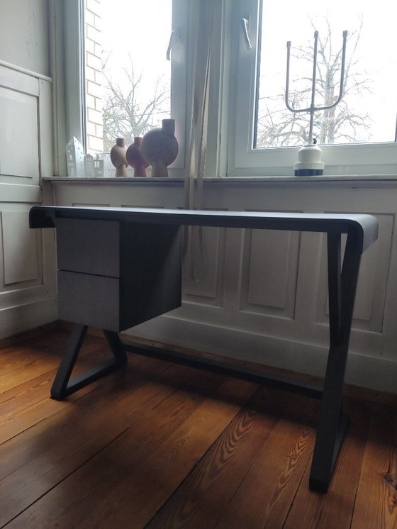 Elegant desk in gray oak. The rounded top of the desk is equipped with a practical cable hole and a drawer compartment under the top. This special piece is usually only available on request from the dealer.