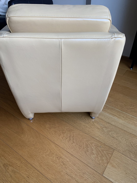 These armchairs are from the Thouche brand. Vanilla leather upholstery in perfect condition.