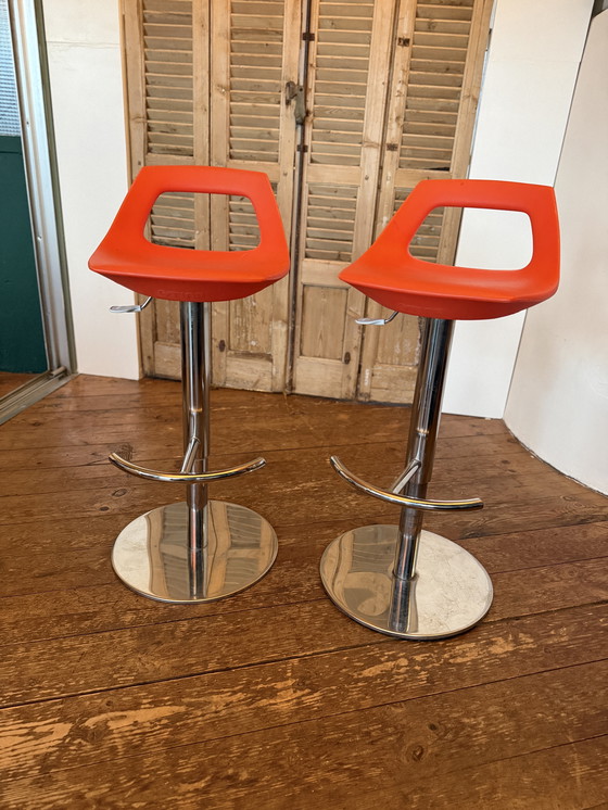 This bar stool is based on the Magis Bombo Stool by designer Stefano Giovannoni and should therefore be considered in the same style. The seat is made of plastic. The leg is made of chromed steel (very heavy-duty) and has a gas spring for height adjustment. Because of its height adjustment, it is suitable for (bar) tables of different heights.