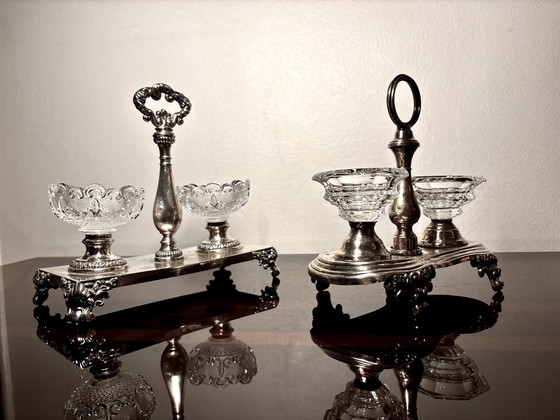 Exceptional Set of two doubled antique silver plated metal table salt servers. Crystal parts produced by Le Creusot (ancient common production of Baccarat & Saint Louis). In very good vintage condition, some traces of time are present. Dimensions : height — 17; 18,2 cm length — 17; 19,2 cm width — 10,5; 9 cm diameter cellars — 7; 7 cm