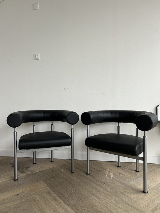 Introducing a pair of Foersom & Hiort-Lorenzen Cobra Chairs, model EJ900, that exemplify modern elegance and sophisticated design. These chairs are crafted with a sleek black leather upholstery, offering a luxurious seating experience, while the sturdy metal frame ensures durability and stability.