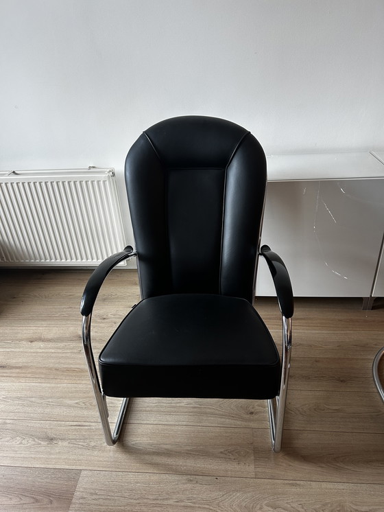 Introducing the Gispen AA Armchair, a distinguished piece that embodies modern elegance and comfort. This chair, with its sleek black leather upholstery, offers a sophisticated touch to any setting, whether it be a professional office or a contemporary living space.