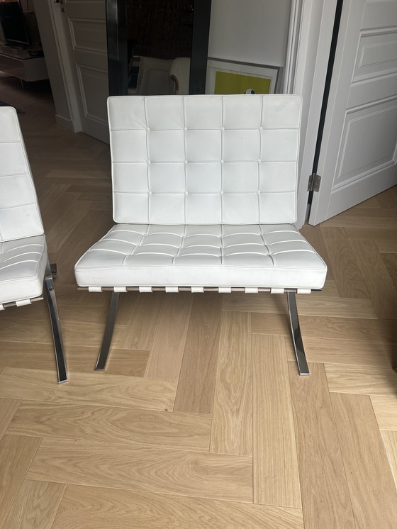 Experience the timeless elegance of the Knoll Barcelona Chairs, a masterpiece of modern design. These iconic chairs, upholstered in pristine white leather, are a testament to sophisticated style and comfort, making them a perfect addition to any contemporary living space.