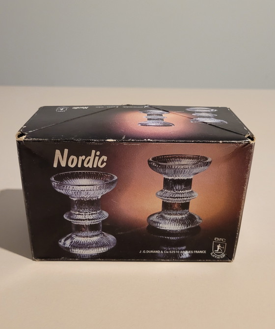 This set of two Luminarc Nordic candlesticks is a wonderful addition to any interior, with a ribbed decor reminiscent of tree bark or ice cream. The candlesticks have a unique ribbed design that reflects light beautifully, and they exude Scandinavian elegance. Perfect for creating a warm and inviting atmosphere in your home. Originating from France, it is clear that these candlesticks are inspired by Iittala's candlesticks from Finland. Produced in the 1970s.