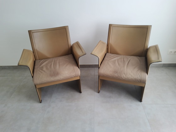 Two vintage Matteo Grassi Korium armchairs in brown leather. Designed in 1978 by Tito Agnoli. Signs of wear mainly on one of the chairs near the armrests (see photos).