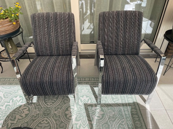 Discover the comfort and style of these modern armchairs, perfect for any contemporary interior. These chairs combine a sleek metal frame with refined black and gray fabric, creating an elegant look.
