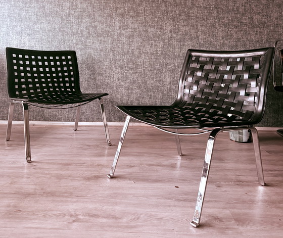 A striking and sculptural pair of Net W lounge chairs designed by Giancarlo Vegni for Fasem and manufactured in Italy. Defined by their elegant, continuous silhouette, these chairs feature a beautifully executed hand-woven full-grain leather seat and back—an iconic Fasem signature—set on a refined polished steel/chrome four-leg base.