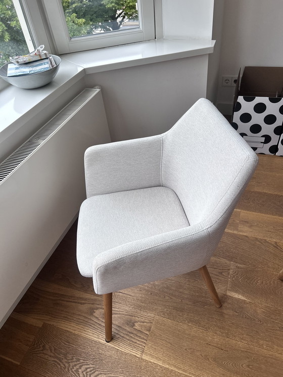 This set of two chairs combines a modern look with comfort. The chairs are upholstered in a soft beige/gray fabric and have sturdy wooden legs. They are perfect for use in the dining room or as additional seating in the living room. The clean lines and neutral colors make them a versatile addition to any interior.