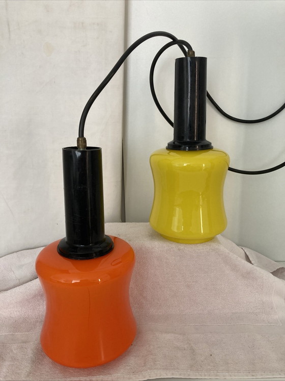 Pendant light in excellent condition, no damage, orange and yellow, black opaline plastic support, vintage Italy