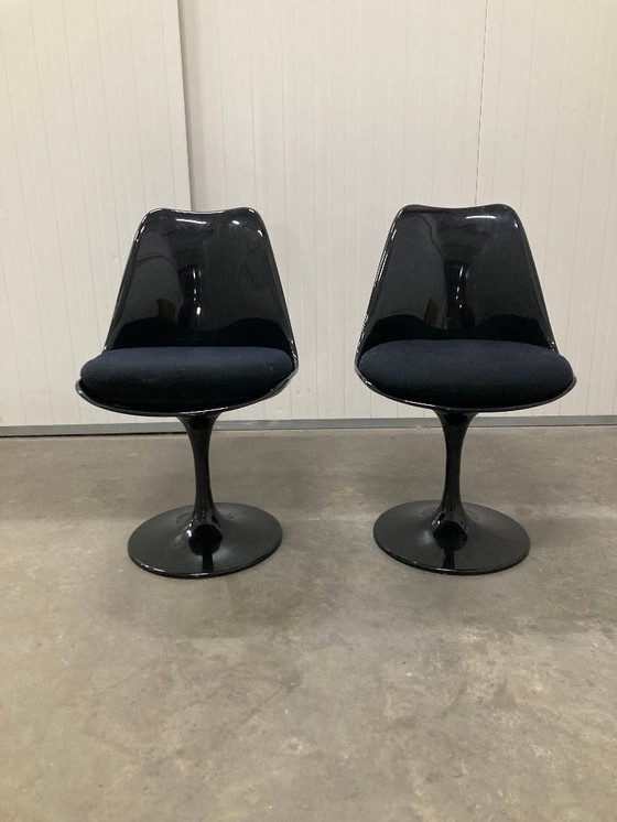 Replica Eero Saarinen Tulip chair from 1940, swivel seat, no armrests, dining chair. Coated aluminum base, glossy plastic seat, fabric cushion. Dimensions: 50 x 43 x 80 cm, seat height 42 cm (48 cm including cushion).