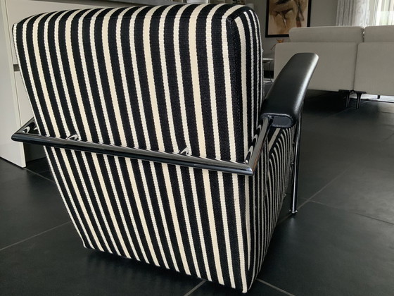 Introducing a pair of exquisite Scylla chairs by Leolux, a testament to modern design and exceptional craftsmanship. These chairs are adorned with a striking black and white striped textile, offering a bold yet elegant statement for any contemporary living space. The chairs feature a robust metal frame that complements the sophisticated upholstery, ensuring both durability and style. Designed with comfort in mind, the chairs provide a plush seating experience, making them ideal for relaxation or entertaining guests. The sleek armrests add a touch of refinement, enhancing the overall aesthetic appeal. Elevate your interior with these distinguished chairs, perfect for those who appreciate the fusion of form and function. Inquire today to make them a part of your home.