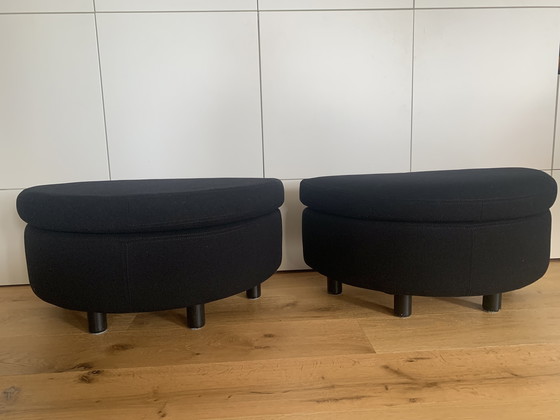 Unique set by Gelderland (design Jan des Bouvrie). The hockers are in very good vintage condition. They are upholstered in a black plow fabric that is very finely woven and has high wear resistance. They have always been pet and smoke free. Half diameter 45 cm. Height 42 cm.