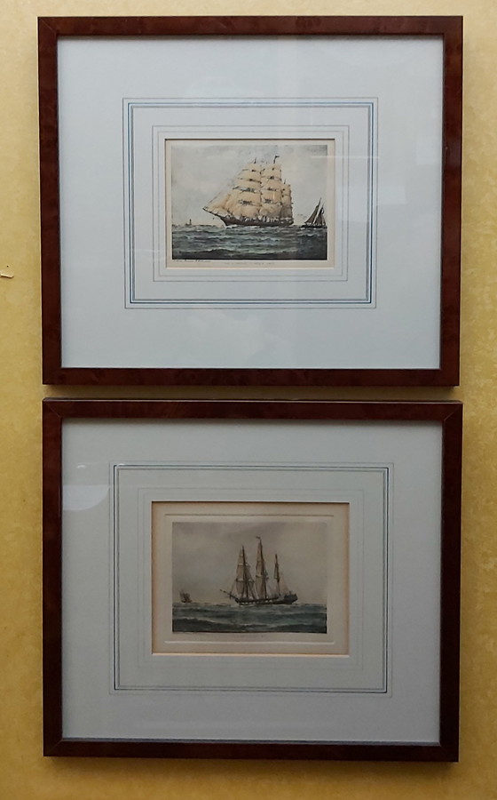 This beautiful set of two nautical prints depicts majestic sailing ships, each carefully framed in a refined wooden frame with glass.