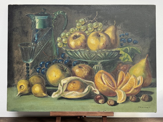 This stunning 20th-century signed oil on canvas (70x50 cm) captures a classic still life, featuring vibrant fruit and elegant glassware.