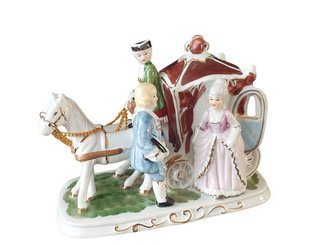 This beautiful figurine depicts an elegant carriage with a white horse surrounded by three figures in period clothing. The carriage is detailed with a rich, red color and gold accents, evoking a sense of luxury and sophistication. The figures, including a lady in a beautiful, pink dress and two gentlemen in stylish outfits, exude a sense of aristocratic charm. Perfect for lovers of antiques, this artwork can be a stunning addition to any interior style. Place it on a sideboard or in a display case to attract attention and add a touch of history to your space. Unsigned.