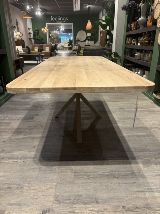 2M Living Budget dining table - 240x98 Made in: Natural wood Leg RAL 1019 Open knots Light scratches on the top Dimensions: Length: 240 cm Width: 98 cm Height: 71.5 cm All sizes are approximate