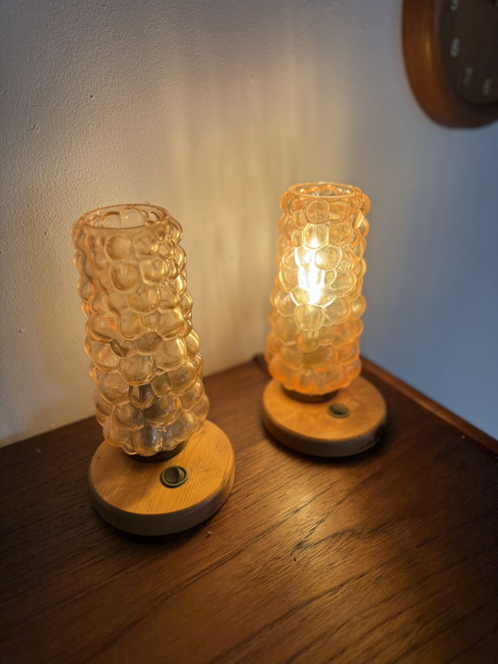 Beautiful and unique set. Oak base with beautiful visible wood grain and a lovely rounded finish. The lamps have an amber bubble glass shade. The light is beautifully diffused, creating a very atmospheric effect. Fitted with a standard E14 socket and a switch on the base.