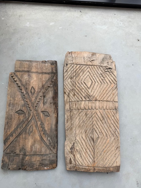 #vintage#, #Bohèmienestyle#, crafted authentic wooden shelves, 2x. Ethnic decoration. for sizes see photos. Are heavy and for sale as a set or separately. The darker version has rectangular corner out, the other is more organic. One is a bit longer - 78 cm- the other 74 cm/34-36 cm wide and thick 6-8 cm I estimate.