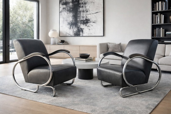 Discover this stylish set of two Dikkert van Dykmeyer chairs in black leather, perfect for any modern space. These chairs combine comfort with a sleek design, ideal for both home and office use.