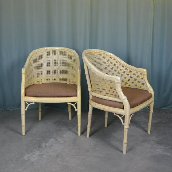 This set of two faux bamboo chairs by Giorgetti, designed in the 1980s, exudes vintage charm. Crafted from wood and rattan, the chairs have an elegant whitewash finish that contrasts beautifully with the brown cushions. Perfect for a stylish seating area, these chairs combine comfort with a timeless aesthetic. Cushions are included for extra comfort.