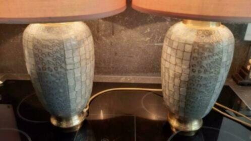 Beautiful set of lamps Firma Regina cloisonne enameled nice quiet colors with two chrome Riviera Maison lampshades. On and off switch on cord. Height of lamp with shade 51 cm, height of lamp without shade 33 cm. Width of lamp 16 cm, width of Riviera Maison lampshades 31 cm. Height of lampshade 17 cm.