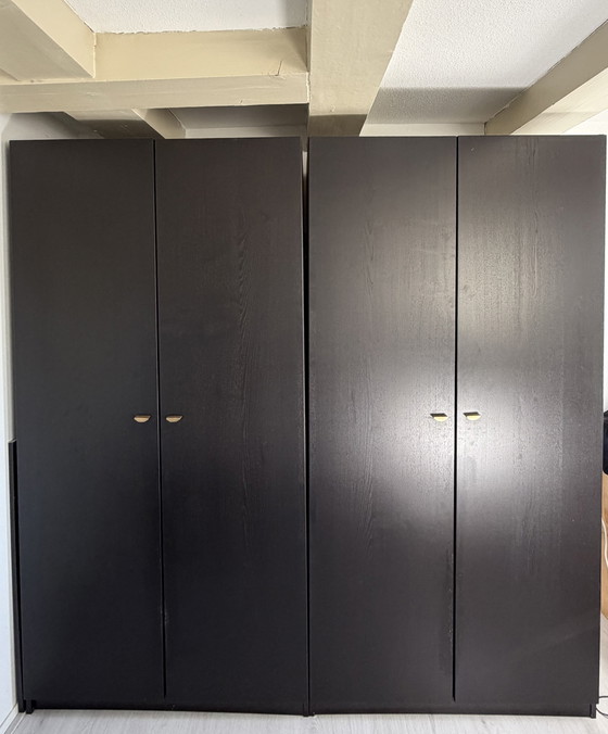 Enhance your storage solutions with these two Ikea Pax wardrobes, elegantly finished in a sophisticated dark brown/black hue. These wardrobes offer a sleek and modern design, perfect for seamlessly integrating into any contemporary bedroom setting.