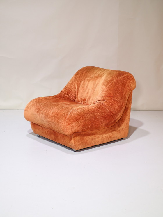 Beautiful and comfortable recliner from Italy, 1970s. This vintage chair has soft, organic shapes and is upholstered with a velvet fabric in a beautiful orange color. A true eye-catcher to lounge in!