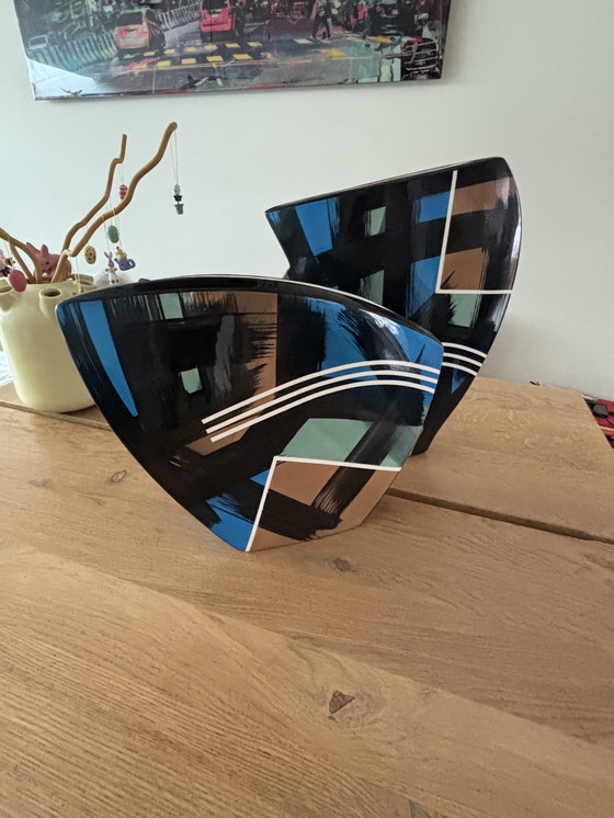 They are striking vases with a graphic pattern and unique shapes. Even without flowers, they are beautiful decorative objects. They actually look best together, but they can also be sold separately.