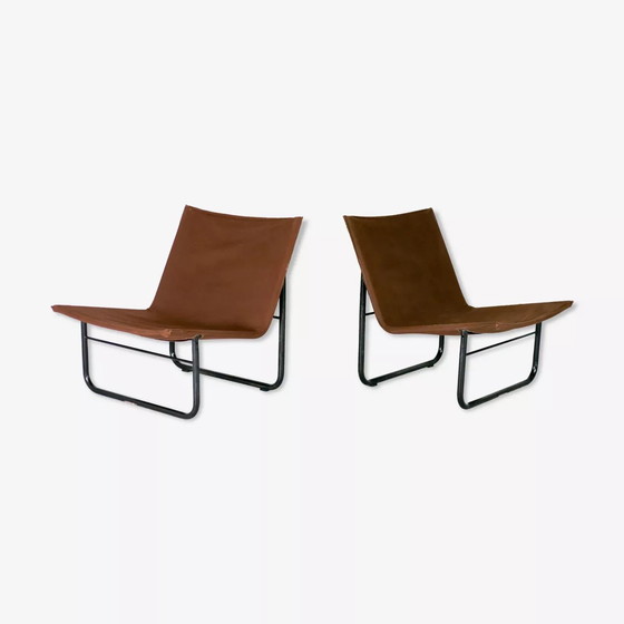 Pair of Kebe armchairs, Denmark, circa 1975. Steel and "chocolate" fabric. Minimalist design. Paint chips on black steel base. Slight fabric wear visible on the sides of one armchair. See photos. But of no consequence. Very slight discoloration on corners. Beautiful design. Solid and stable.