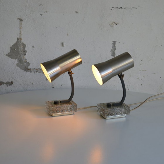 Set of 2 bedside lamps from the 1970s. These lamps combine a chrome-colored metal shade with a glass base, creating a stylish look. Equipped with original EU wiring and suitable for E14 bulbs. Perfect for a retro bedroom or as accent lighting in a modern interior.