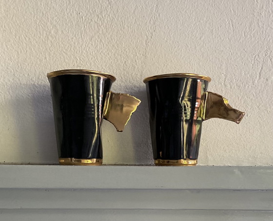 Black and gold. One cup is broken and glued with traditional Japanese technique ( kintsugi)