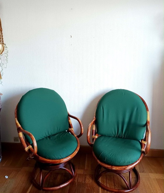In very good overall condition. Note: the rattan has warped and split at the legs, but this does not affect the stability or sturdiness of the chairs. There is a slight rattling sound when swiveling, and some wear to the straps (they have been refinished to strengthen and preserve them).