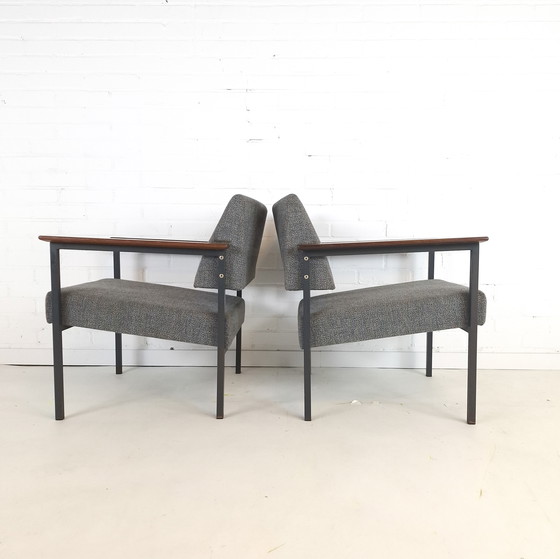 In vintage condition, with signs of wear. Please note that the fabric is approximately 50 years old (still looks good, but has a 60s/70s smell). Armrests have clear signs of wear. Photos are part of the description.