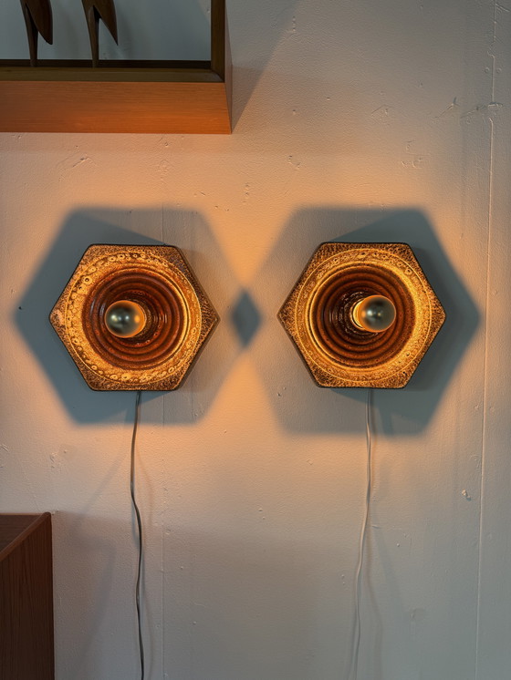 Beautiful set of ceramic wall tiles from West Germany. Beautiful ornaments in an elegant hexagon shape. Finished in the popular fat lava style with beautiful colors. Fitted with a regular E27 socket.