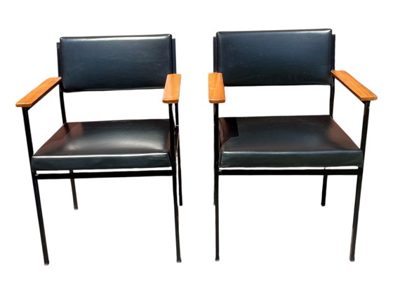 This set of two vintage dining chairs designed by Gijs van der Sluis combines a classic look with sturdy construction. The chairs have a metal frame with wooden armrests and a comfortable leather seat and back. Perfect for lovers of retro design.