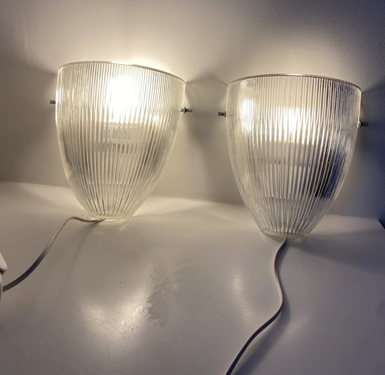 A set of large wall lamps from Massive with a beautiful ribbed glass shade. They provide a lovely diffused light and are a real eye-catcher on the wall.