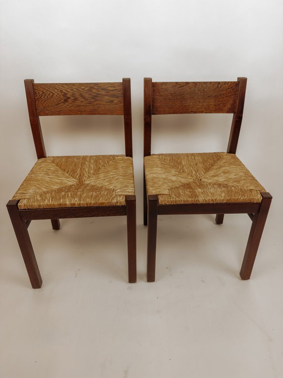 A set of two vintage dining chairs in the style of Martin Visser. The chairs are made of solid wenge wood with a woven rush seat. In excellent condition.