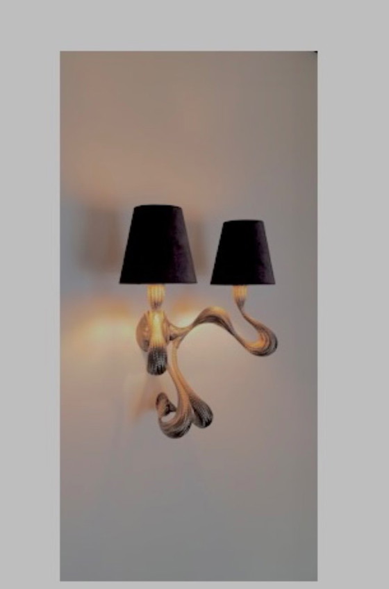 The Ode wall lamps are handmade from a knitted precious material with metal wire - color 15 light dark nickel - 44 cm wide and 47 cm high - shades in blue velvet - new, never used - new price per piece 2100 euros -