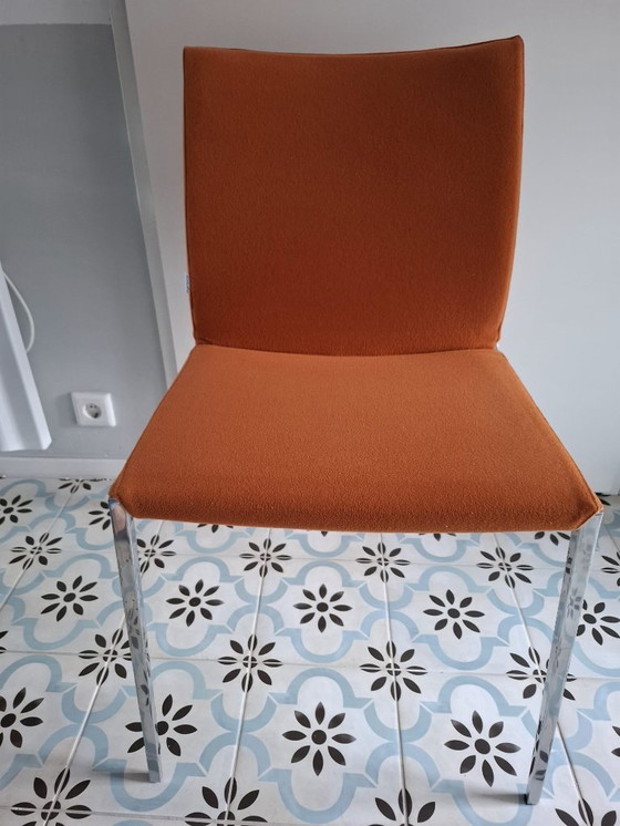 The Lia is made of a thin aluminum frame with four slender legs. The seat and back are thinly upholstered with polyurethane, giving the chair a pleasant comfort. The seat is fully enclosed with a removable orange fabric.
