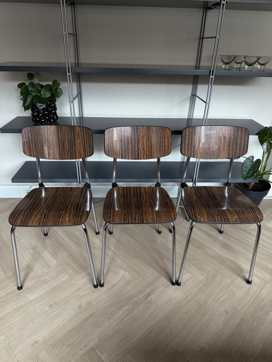 Set of 3 retro brown/wood formica & chrome (dining room) chairs + optional 1 free, so then 4 total (which is not so stable anymore and has a little damage, see last photo)