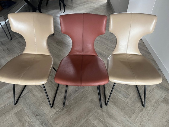 3 beautiful leather dining chairs by Leolux. 2 beige and 1 terracotta/pink. With artisan stitching. With sled base and special felt pads. Purchased in 2023, original price 840 euros each. Price is for all 3 chairs.