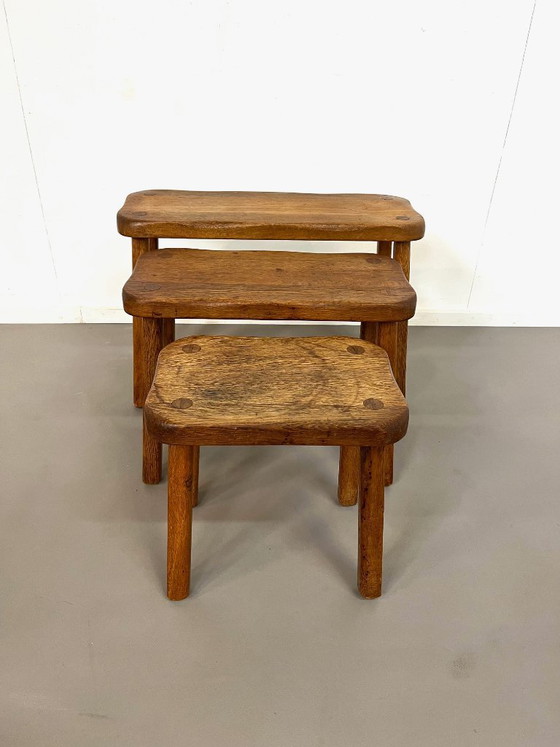 A Brutalist set of 3 solid oak side tables, circa 1960. Made in France. Height 44 cm, width 63 cm, depth 24 cm