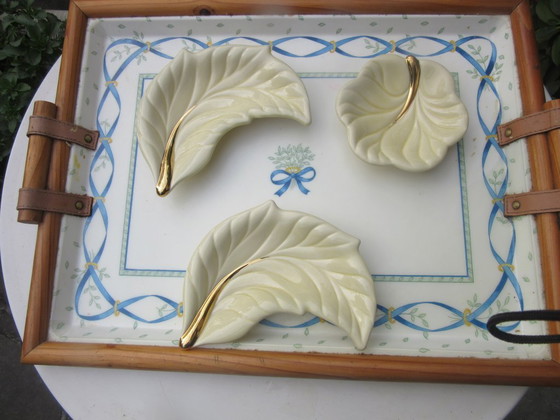 Elevate your dining experience with this exquisite set of 3 Verceram Art Deco serving trays. Each piece is a testament to the elegance and craftsmanship of the Art Deco era, featuring a sophisticated leaf design with a luxurious gold accent that gracefully complements the creamy ceramic base. Perfect for both formal gatherings and intimate dinners, these trays are not only functional but also serve as a stunning decorative element in any setting.