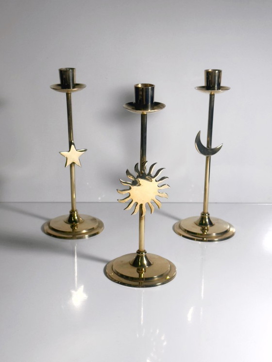 Three beautiful brass candlesticks in the Whimsigoth style: sun, moon, and star. A lovely set from the 1990s. 26 cm high 10 cm diameter