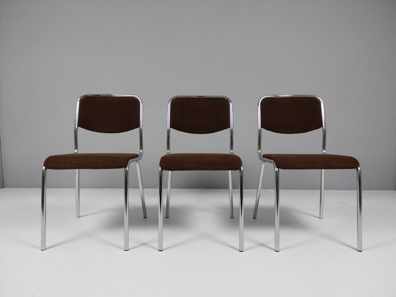 A set of three vintage chairs from the Belgian design company Bulo. The chairs have a sleek and timeless design with a sturdy chrome-plated metal frame and a comfortable seat and backrest, upholstered in brown fabric. The design is functional and modern, characteristic of Belgian design from the second half of the 20th century. Ideal as dining chairs, conference chairs, or as a stylish addition to an office or interior design project.