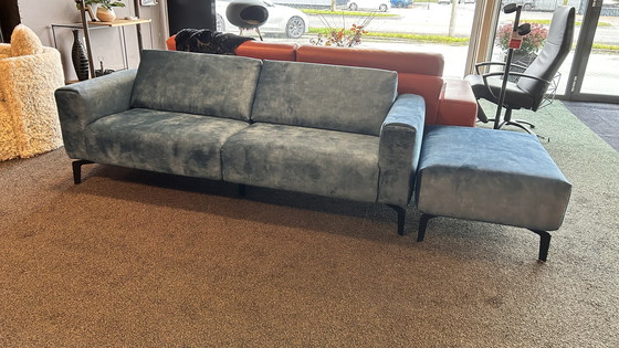 Experience the perfect blend of style and comfort with the Sensoo 3-seater sofa, complete with a matching ottoman. This modern piece, upholstered in soothing blue fabric, is a serene addition to any living space. The slender metal legs provide a sturdy base and guarantee both durability and elegance.
