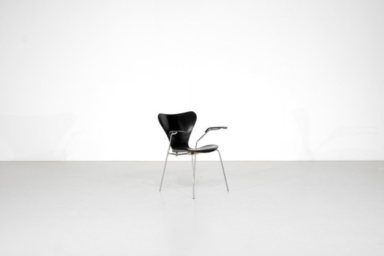 Butterfly chairs with armrests model "3207" series 7 in black wood on a chrome-plated metal frame.