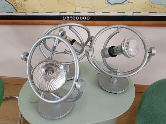 Designed by Italian designers Franco Bettonica and Mario Melocchi, this set of three Cini & Nils Fariuno wall/ceiling lamps offers a functional and stylish lighting solution. The lamps feature a multi-adjustable fixture, making them ideal for modern environments that require flexibility. The round locking ring can be rotated 270°, the light-bearing mounting bracket can tilt up to 90°, and the head can be rotated up to 320°. These lamps are still available in specialized lighting stores. On whoppah, one copy pad was sold at 60€.
