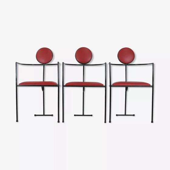 Dimensions: H80 x W57 x D60 Color: Red Materials: Metal Style: Design Set of 3 designer steel and leather armchairs, France, circa 1980. Very comfortable. Steel rods and red upholstered leather. Wear consistent with age (traces, leather scratches of no consequence, see photos). In good condition. Sleek design.
