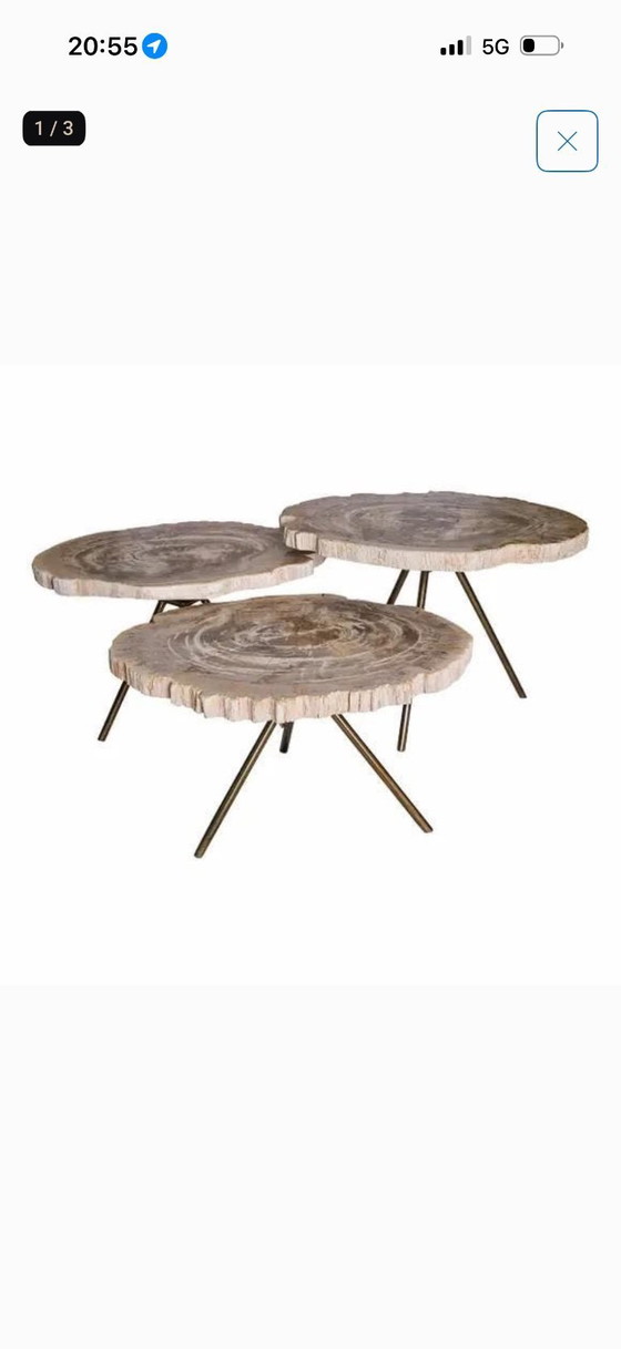 Discover the timeless elegance of this set of three Eichholtz coffee tables, crafted from petrified wood and supported by a sturdy metal tripod. These tables are not only functional but also works of art in themselves, with their unique patterns and natural color variations creating a warm and inviting atmosphere in your living room.